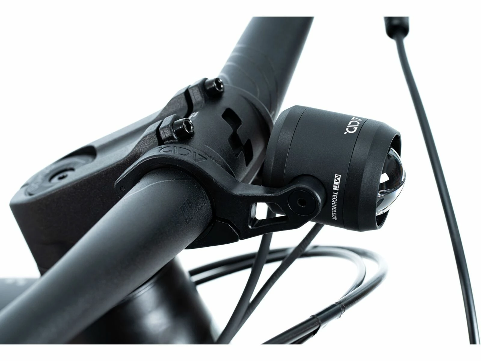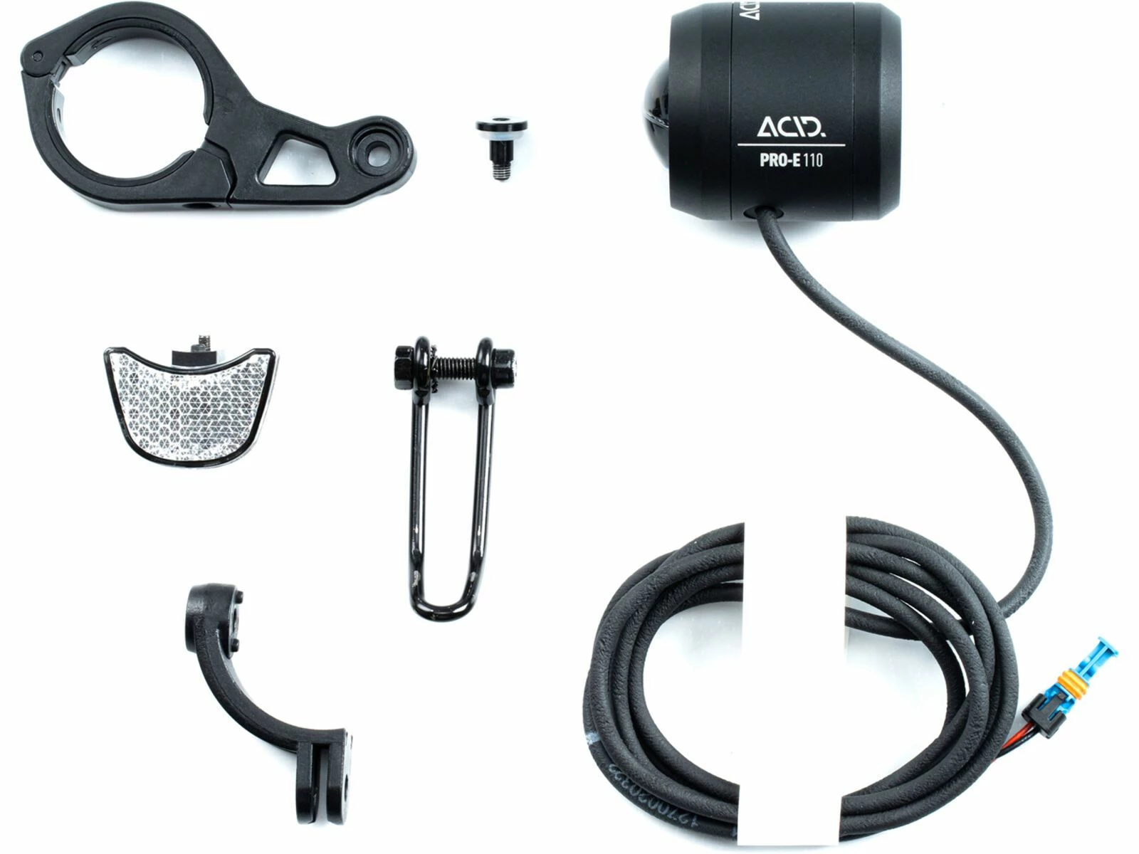 Spot an für das Acid E-Bike Frontlicht Pro-E 110! Für herausragende Ausleuchtung sowohl im Straßenverkehr als auch im Gelände sorgt die Linse mit MTi Technology und lässt das leistungsstarke Licht mit 110 Lux und 550 Lumen in die Dunkelheit strahlen. Mit dem 130 cm langen Lichtkabel mit BES 2 Stecker für Bosch Motoren ist der Anschluss am E-Bike ein absolutes Kinderspiel. Inklusive Lenkerhalter für 31,8 und 35 mm Durchmesser, GoPro-kompatiblem Universaladapter und Gabelhalter für flexible Montage.