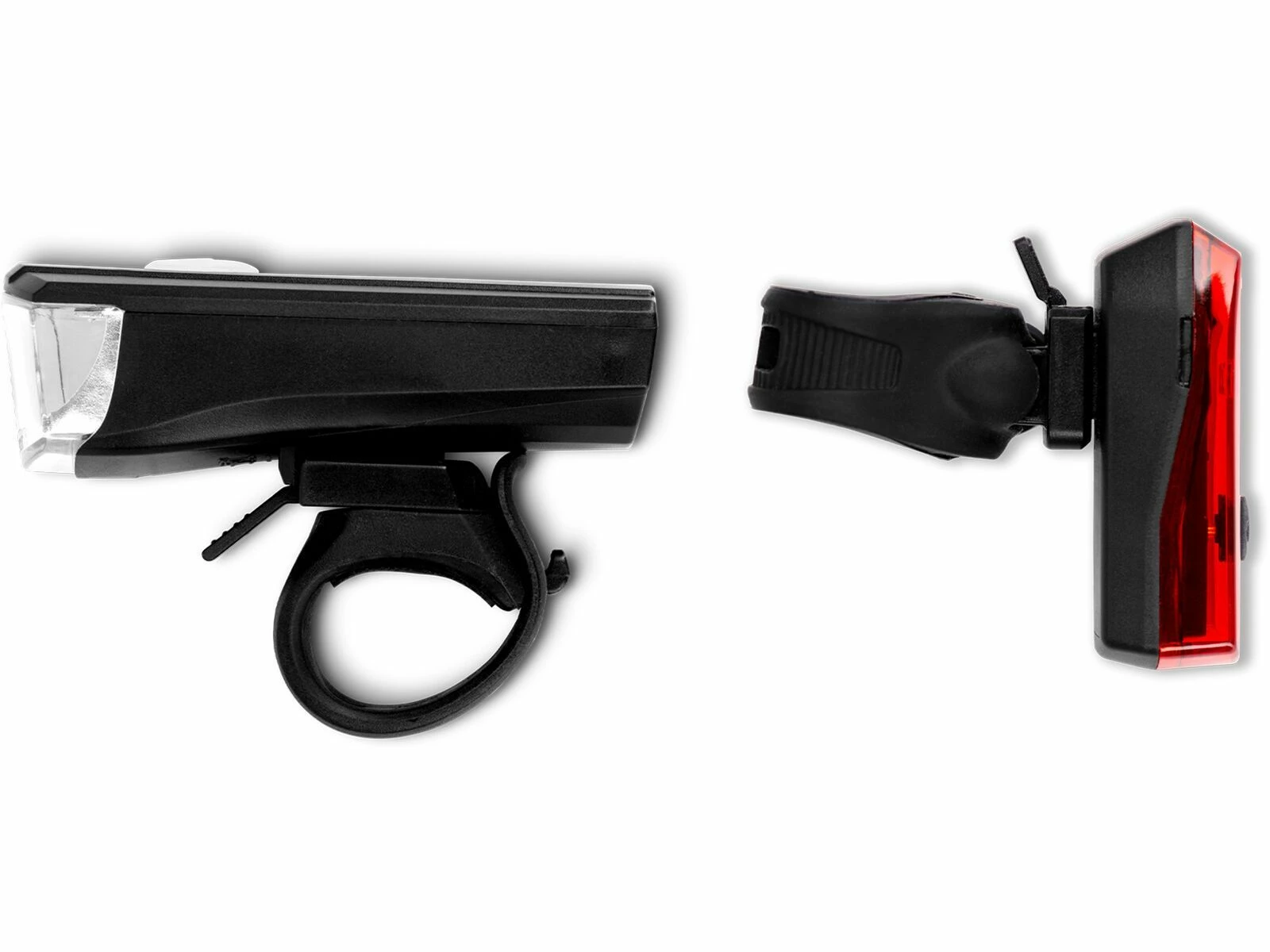 Das akkubetriebene LED-Frontlicht mit 30 Lux wird per hochwertigem Halter am Lenker angebracht. Dieser ist winkelverstellbar und ermöglicht so eine individuelle Einstellung. Das passende LED-Rücklicht mit 2-stufigem Batterieindikator wird mit einem Silikonband befestigt. Beide Lichter sind auch bei feuchten Witterungsverhältnissen dank Spritzwasserschutz einsetzbar und natürlich StVZO zugelassen.
