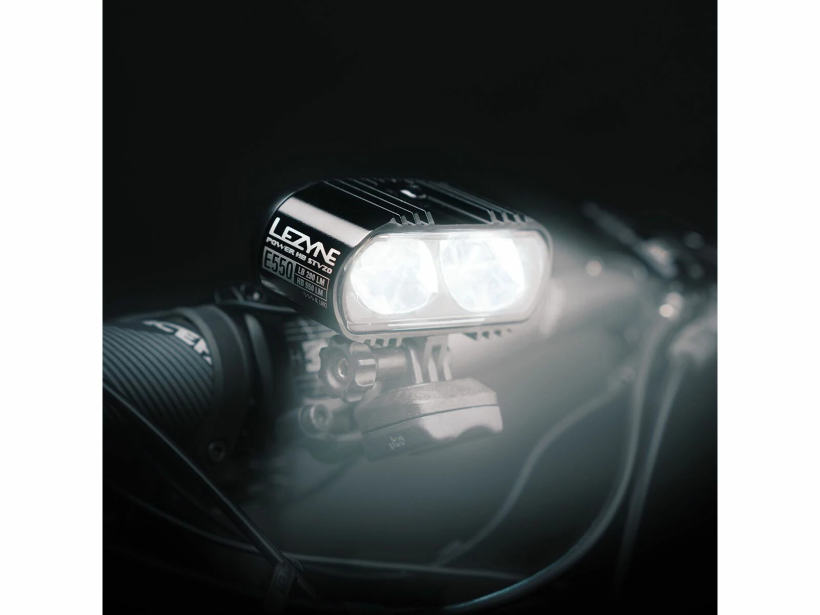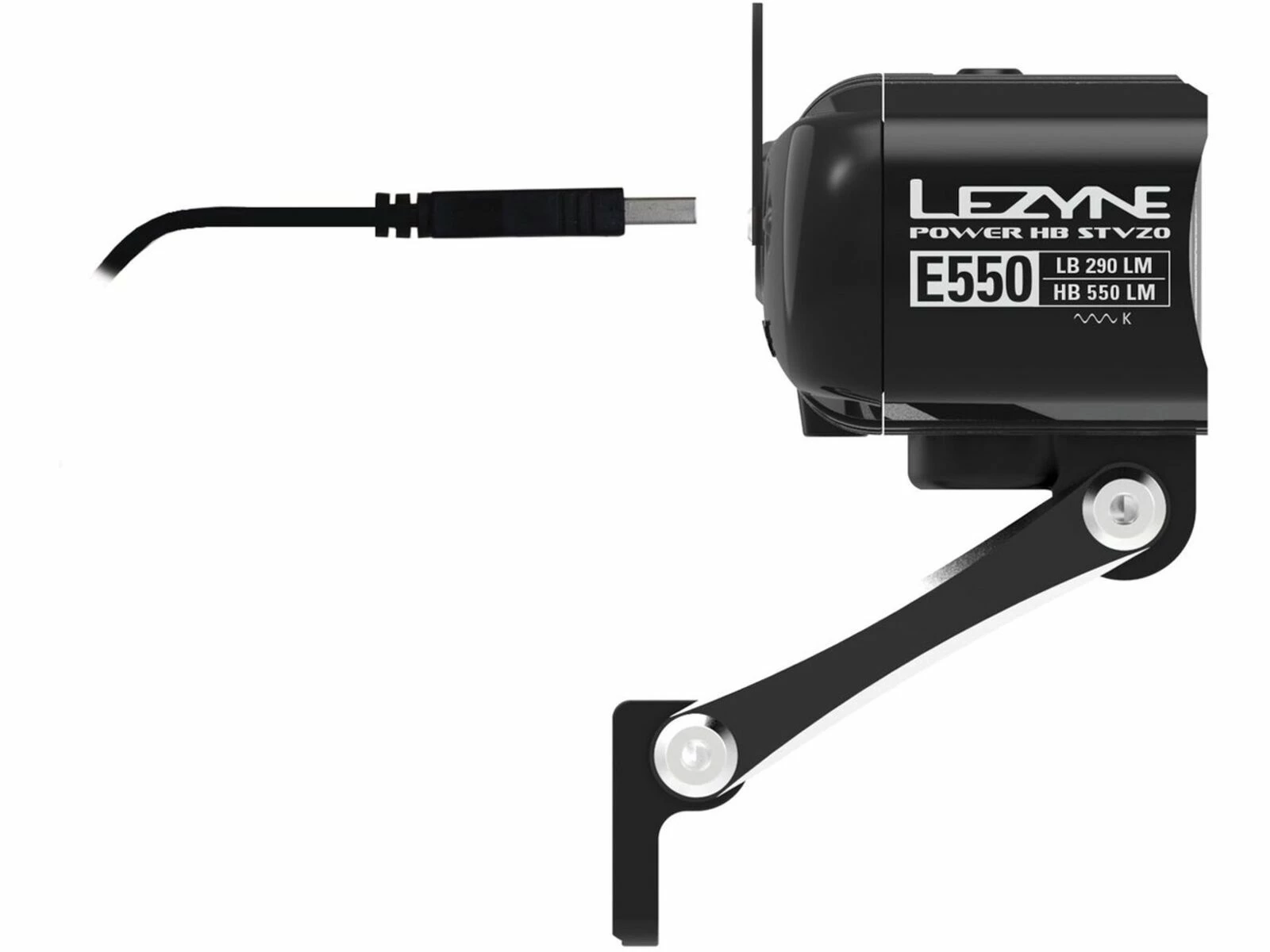 Der E-Bike Power HB StVZO E550 Scheinwerfer von Lezyne hat eine für die deutsche StVZO optimierte Linse mit zugelassenem Flut- und weitreichendem Fern- und Abblendlicht. Die beiden Osram OBF 1 Hochleistungs-LEDs liefern 290 Lumen im Abblendlicht und 550 Lumen im Fernlicht. Der Scheinwerfer besteht aus einer langlebigen, wärmeableitenden CNC-gefräste Aluminiumkonstruktion. Er ist E-Bike-kompatibel und hat einen 6 – 12 V-Eingang (DV), einen Verbrauch von 9 Watt und ist leicht an Batterien von Spitzenherstellern wie Bosch, Shimano und Yamaha anzuschließen. Der eingebauter USB-Port kann externes Zubehör, wie dein Handy, GPS-Geräte oder eine Powerbank aufladen. Die E-Bike Power HB StVZO E550 Lampe kommt inklusive X-Lock-Vorbauhalterung und CNC-gefräster Aluminium-Gabelhalterung und 130 cm langem Stromkabel.Features Scheinwerfer