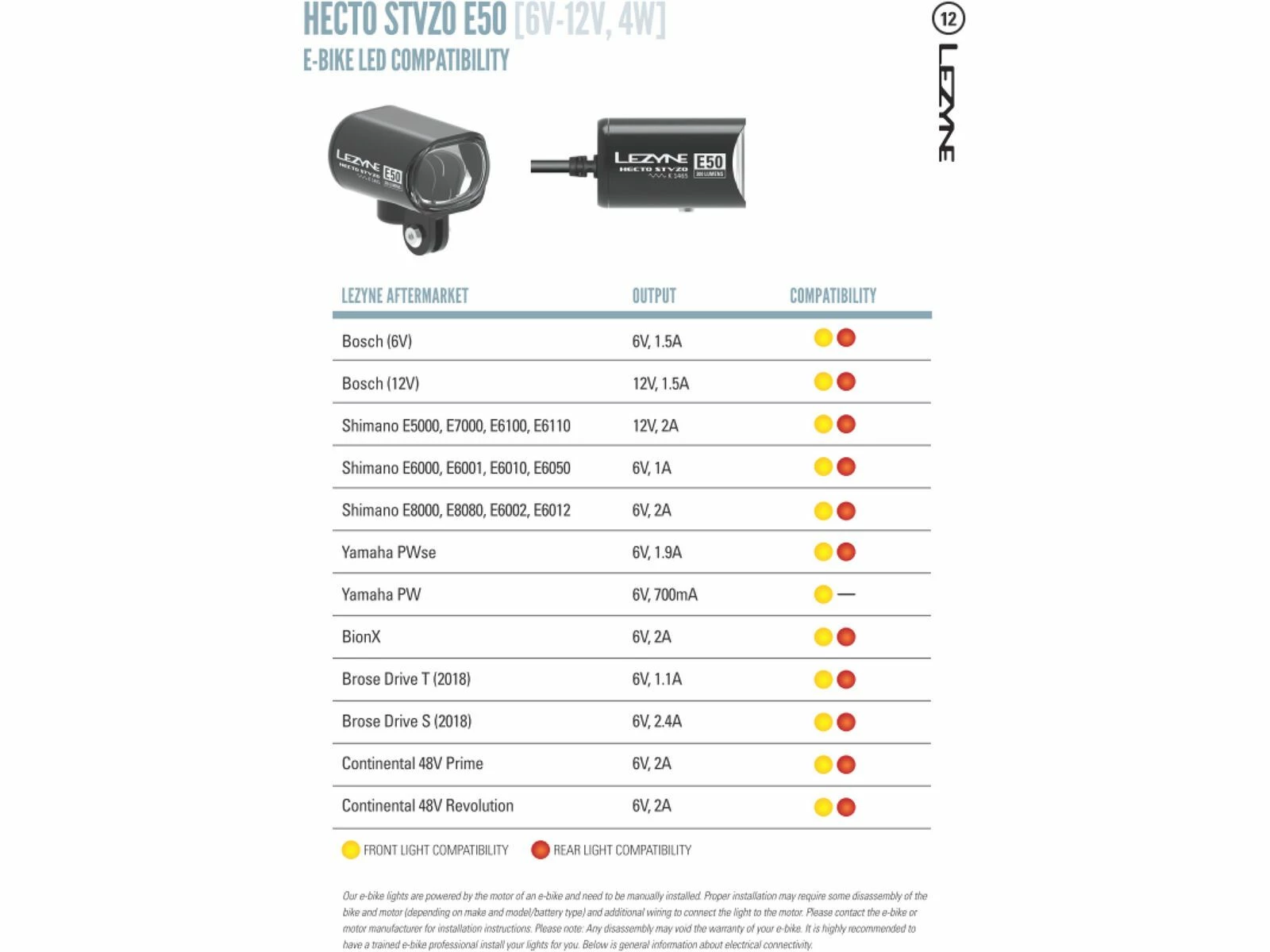 Das Lezyne Hecto Drive E50 Frontlicht ist ein StVZO-optimierter Scheinwerfer mit zugelassenem Flut- und Fernlicht. Eine Hochleistungs-LED liefert im Dauerbetrieb 200 Lumen. Die Lampe besteht aus einer langlebigen, wärmeableitenden, CNC-gefrästen Aluminiumkonstruktion. Die Hecto Drive E50 ist E-Bike kompatibel und hat einen 6-12 V Eingang, der 4,5 W Stecker passt für alle Akkus von Top-Herstellern wie Bosch, Shimano und Yamaha. Der Scheinwerfer kommt inklusive Edelstahlgabelhalterung und 130 cm langem Netzkabel.Features Scheinwerfer