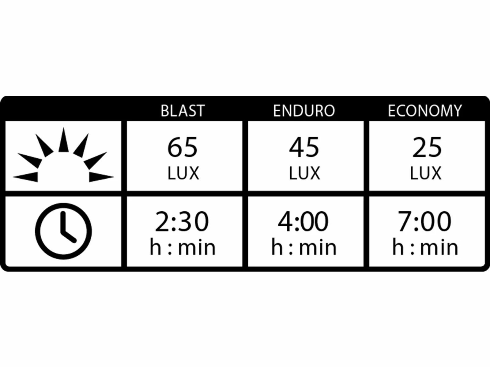 - 65 / 45 / 25 Lux (Blast / Enduro / Economy)