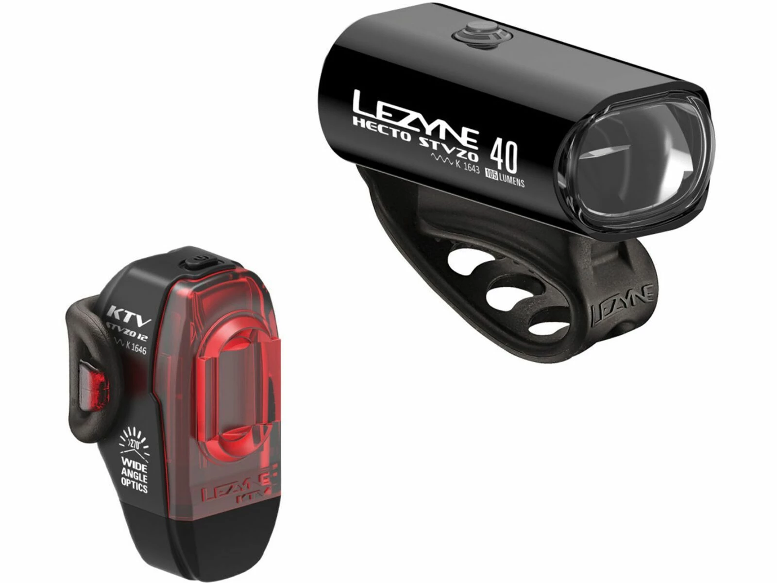 Das Lezyne Hecto StVZO 40 / KTV StVZO Beleuchtungsset mit Scheinwerfer und Rücklicht. Die Lezyne Hecto Drive 40 Frontlampe hat eine auf die deutsche StVZO optimierte Linse mit zugelassenem Flut- und Fernlicht. Die Hochleistungs-LED liefert 40 Lux (140 Lumen) im Blast und 15 Lux im Economy Modus und hat bis zu sieben Stunden Leuchtzeit. Der Scheinwerfer ist aus einer langlebigen, wärmeableitenden CNC-gefräste Aluminiumkonstruktion gefertigt. Der vielseitige Strap passt sich bestens an die meisten Lenkerformen und -größen an. Das Lezyne KTV Drive Rear ist eine kompaktes und gut sichtbares Sicherheitsrücklicht. Die StVZO optimierte Linse steuert die Lichtaustrittsrichtung. Das KTV Rücklicht hat eine langlebige und wasserdichte Konstruktion nach IPX7-Standard. Das Zwei-LED-System bietet 11 Lumen Lichtleistung und bis zu 12 Stunden Laufzeit. Die Weitwinkellinse sorgt dabei für bis zu 270° Sichtbarkeit. Die KTV Drive Rear hat ein einzigartiges Aero- und Sattelstützen-kompatibles Design und der integrierte USB-Stick ist zum bequemen, kabellosen Aufladen gedacht.Features Scheinwerfer