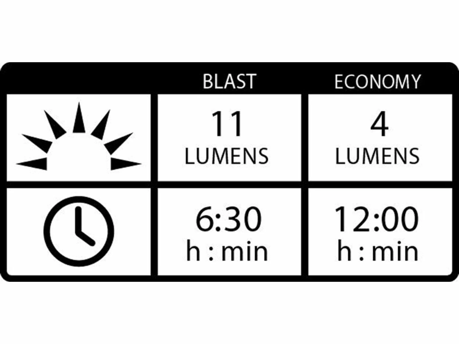 - 6:30 / 12 h Leuchtdauer (Blast / Economy)