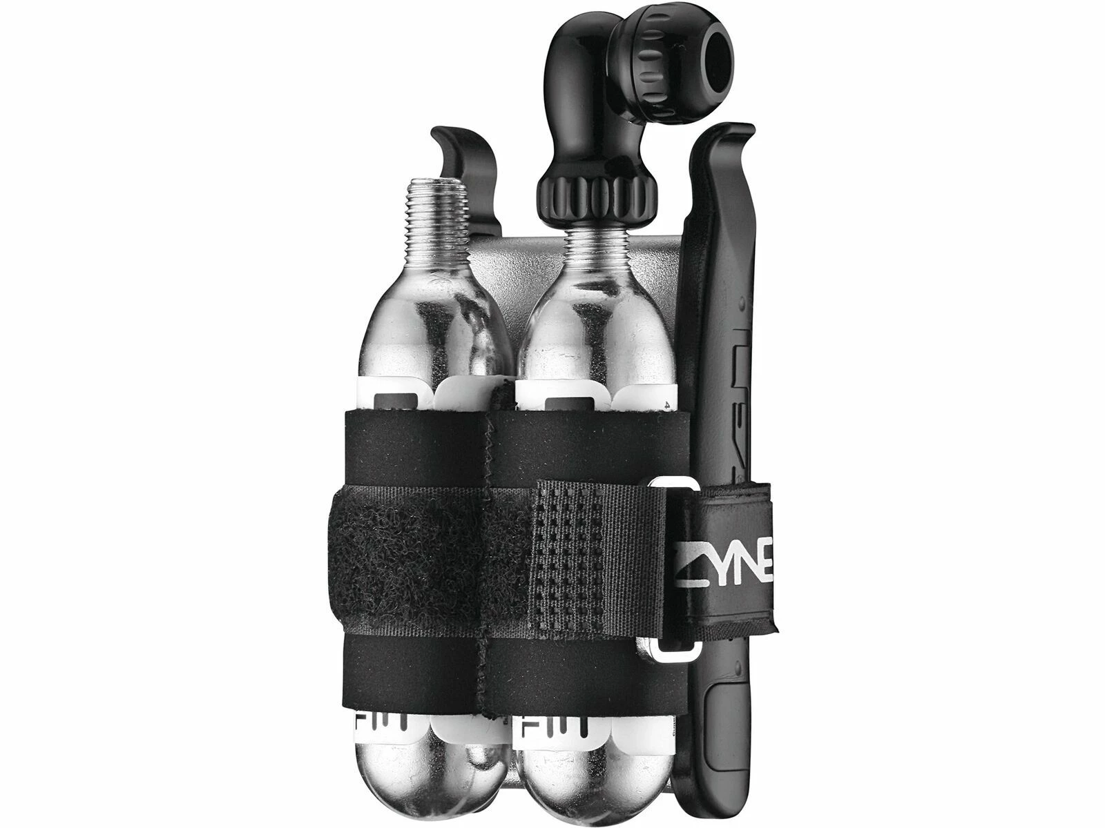 CO2 System kombiniert mit einem Tire Repair-Set – Twin Speed Drive und Lever Kit. Zusätzlich beinhaltet das Set zwei 16g CO2 Drehkartuschen und zwei Reifenheber. Zusammengehalten werden die einzelnen Teile von einer Neopren Aufbewahrungseinheit mit Klettverschluss.Features
