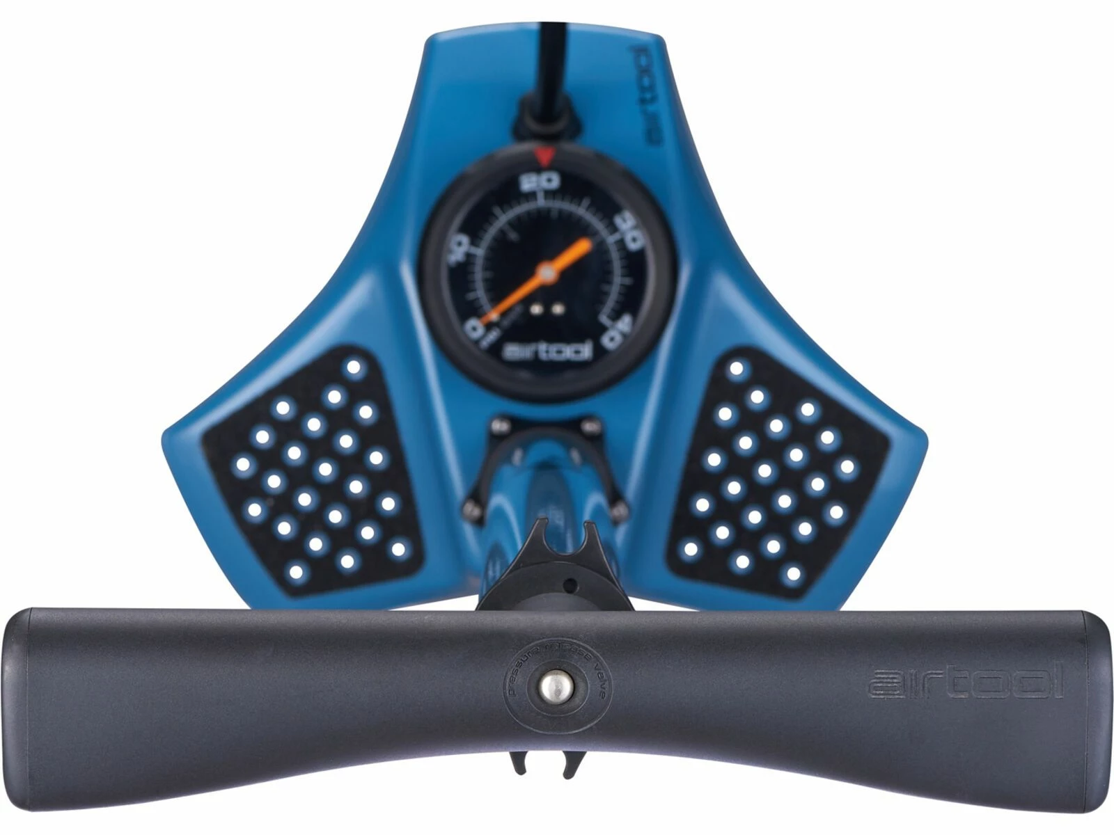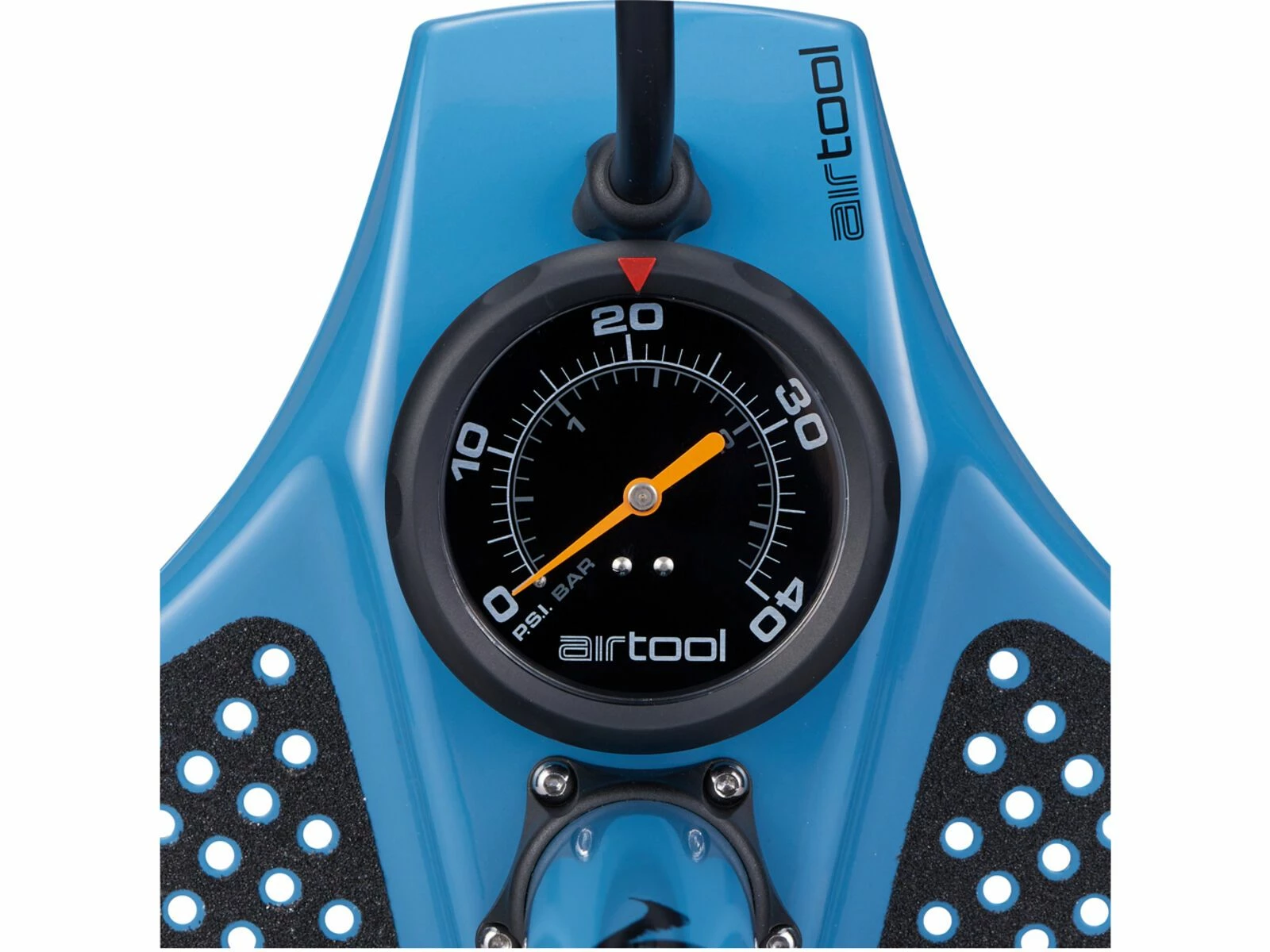 - das übergroße Manometer (76 mm Durchmesser) hat einen Bereich von 0 – 2,7 bar (0 – 40 PSI) und eine Genauigkeit von +/-2 % für maximale Genauigkeit beim Befüllen großer Reifen