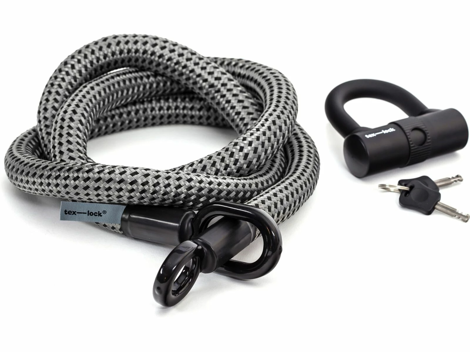 Schließe dein Fahrrad an jedem Ort sicher an – mit dem Tex-Lock Eyelet Fahrradschloss. Das Tex-Lock Eyelet ist ein Textilschloss mit Ösen und gehärtetem Metallkern. Es besteht aus verschiedenen Lagen Textilfasern in einem Verbund. Jede Lage erfüllt eine spezielle Funktion und schützt dein Bike vor Diebstahl und Angriffen mit Bolzenschneider, Feuer oder Säge. Die weiche Oberfläche des Tex-Lock bewahrt dein Fahrrad vor Kratzern und deine Ohren vor Klappern.
