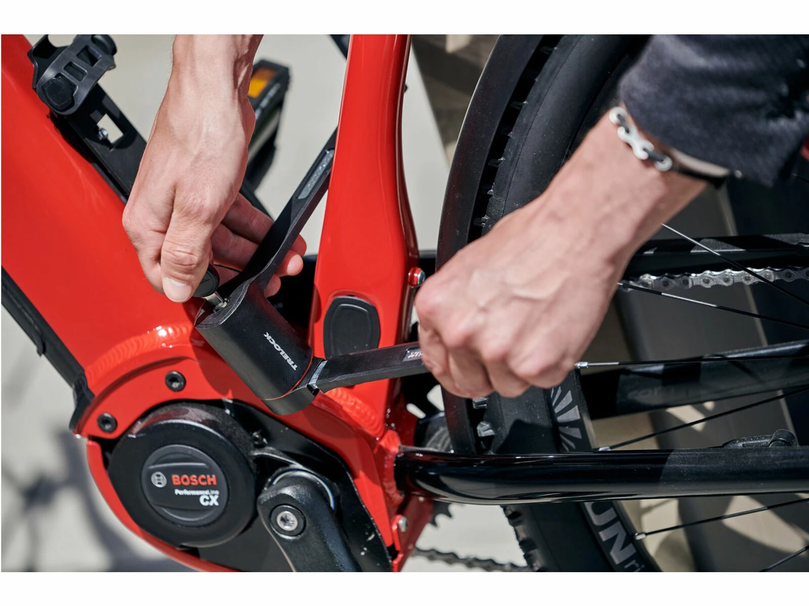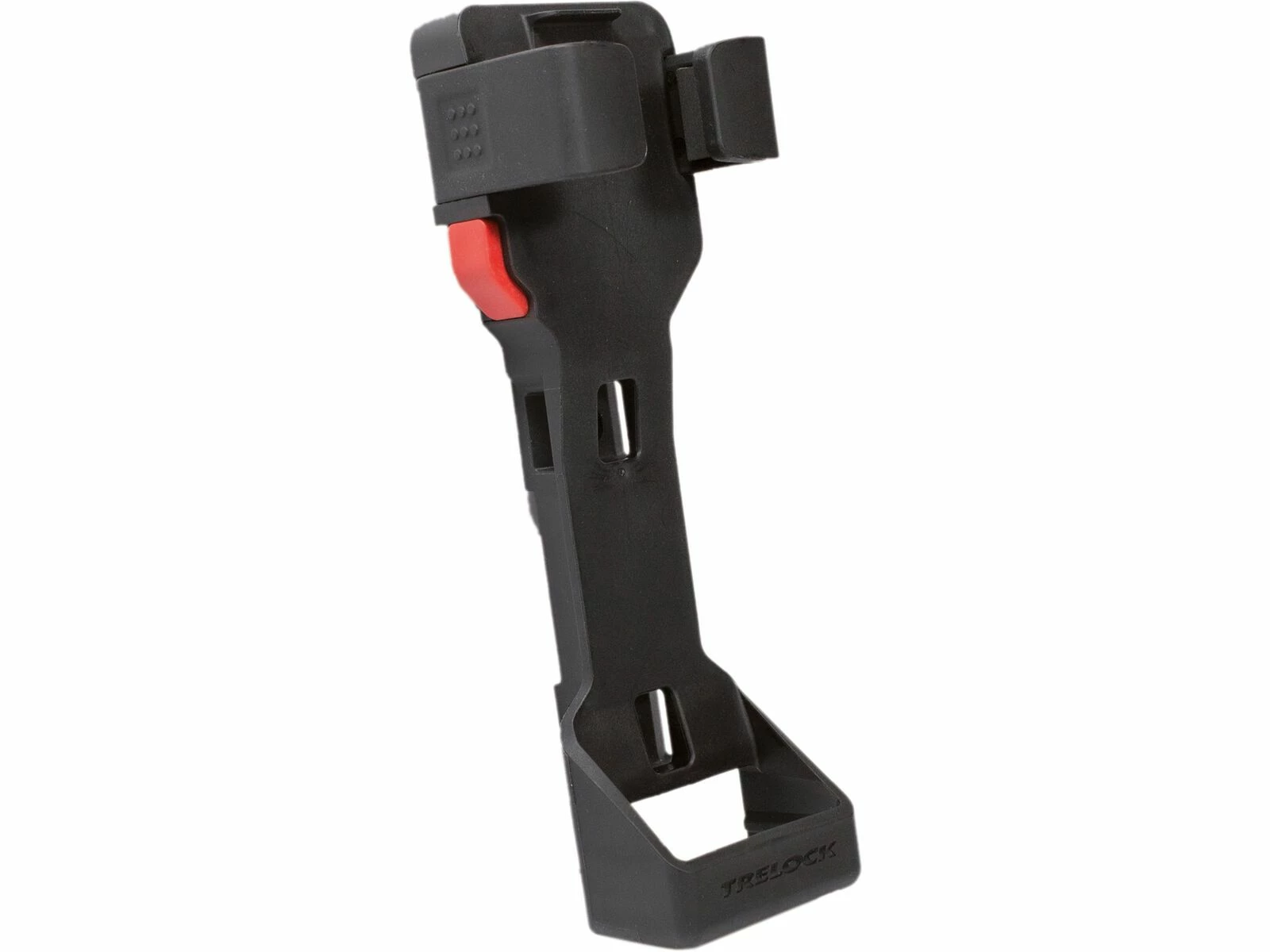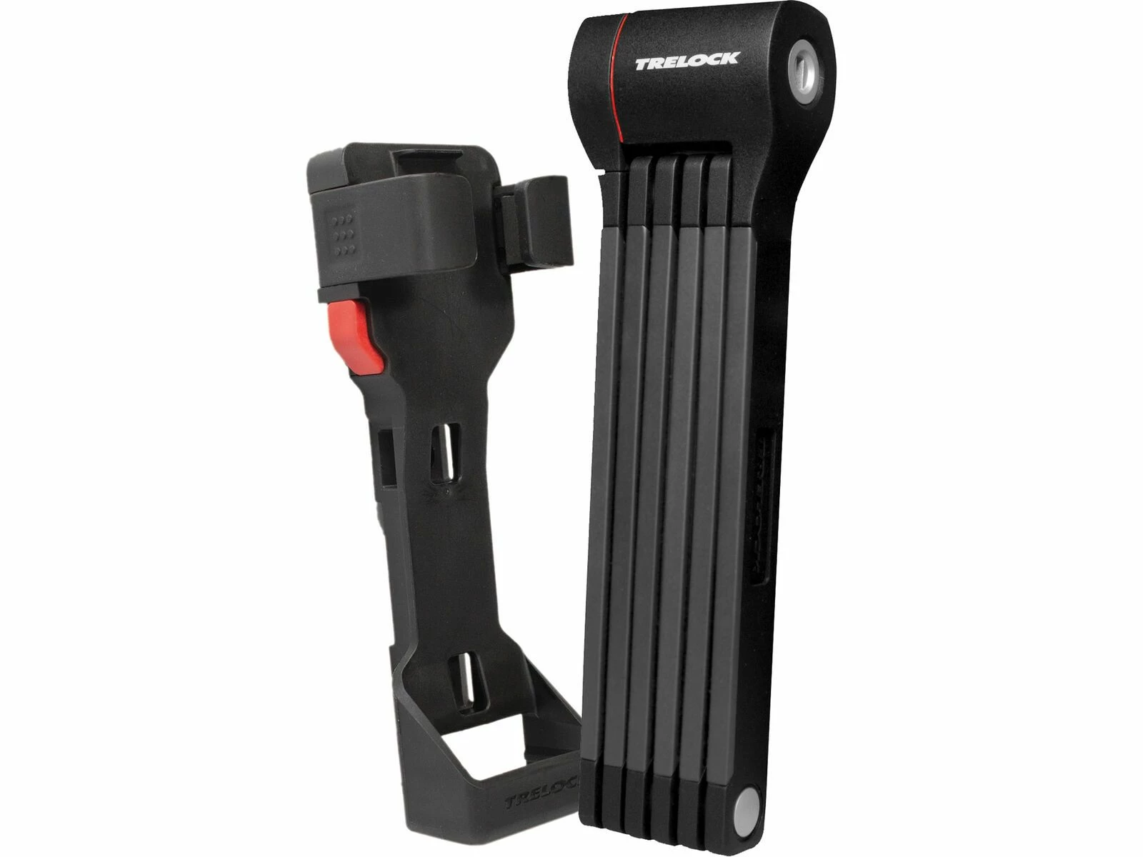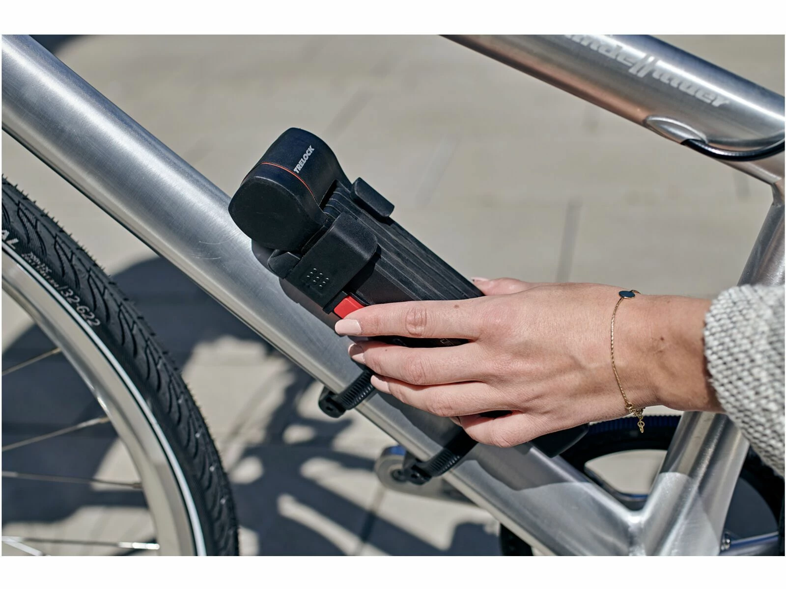 Das neue FS 480 Cops in neuer Trelock-Optik ist der kompakte Neuzugang in der beliebten COPS-Faltschloss-Serie. Die gummierten Schließstäbe aus gehärtetem Stahl lassen sich bis zu 1,00 m Länge entfalten. Das Anschließen an einen festen Gegenstand gelingt noch einfacher. Für das einfache Abschließen ist das FS 480 Cops mit einem um 360 Grad drehbaren Schließbereich am Schlosskopf und einem Wendeschlüssel ausgestattet. Der IN-X-Zylinder wird durch eine Schutzkappe vor Staub und Schmutz geschützt. Die 100-cm-Version wird mit der neuen X-Press-Halterung geliefert. Der neue Verriegelungsmechanismus der X-Press-Halterung macht das Entfernen und Einsetzen des Schlosses noch einfacher. Um das Schloss zu entnehmen, drücken Sie den roten Knopf und das Schloss wird freigegeben. Um das Schloss wieder in der Halterung zu befestigen, drücken Sie die Bügel einfach zusammen.